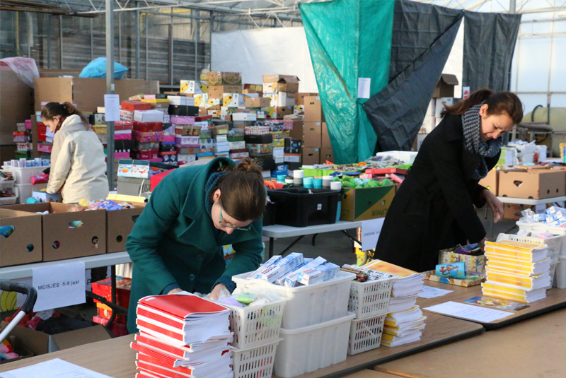 We staan namelijk aan de vooravond van de opening van ons 'pop-up' sorteercentrum. Drie weken lang zal ikzelve, samen andere vrijwilligers zo'n 8000 schoendozen nakijken en sorteren. Vandaag was het centrum nog gesloten voor vrijwilligers, maar er werd al heel hard gewerkt! En vandaag draaiden we met z'n vijven een proefdag om de kinderziektes er reeds uit te helpen! Met succes, want alles loopt vrijwel op rolletjes..
